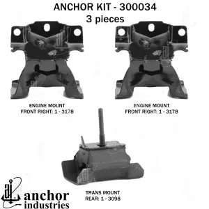 - Description: Anchor 300034 Engine Mount KIT Each part of this kit is specifically Engineered and manufactured to meet or exceed OE standards to ensure perfect fit and function. Natural and SBR rubber provide maximum life and performance. Steel fasteners are heat treated grade 5 bolts. A special bonding agent is used to ensure a rubber to metal bond. Rubber material is mixed to specific Durometer, hardness. 12 Month Warranty.