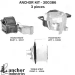 - Description: Anchor 300386 Engine Mount KIT Each part of this kit is specifically Engineered and manufactured to meet or exceed OE standards to ensure perfect fit and function. Natural and SBR rubber provide maximum life and performance. Steel fasteners are heat treated grade 5 bolts. A special bonding agent is used to ensure a rubber to metal bond. Rubber material is mixed to specific Durometer, hardness. 12 Month Warranty.