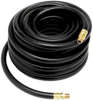 25 feet. 3/8" inside diameter with 1/4" NPT fittings. Handles up to 300 PSI working pressure. Lightweight, flexible, rubber hose is resistant to abrasion, kinks and weather.