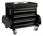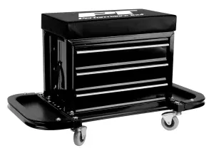 Reinforced seat supports up to 350 lbs. 3-drawer tool box with roller bearing slides. Two folding tool trays with magnetic pads. Vinyl padded seat cushion for maximum comfort and support. 2-1/2". polyvinyl chloride full bearing casters for