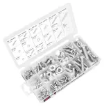 Sizes: M4 x 20m bolt 10 pcs, M4 x 12m bolt 10 pcs, M4 washer 20 pcs, M4 nut 20 pcs, M5 x 25m bolt 10 pcs, M5 x 16m bolt 10 pcs, M5 washer 20 pcs, M5 nut 20 pcs, M6 x 30m bolt 10 pcs, M6 x 20m bolt 10 pcs. M6 washer 20 pcs, M6 nut 20 pcs, M8