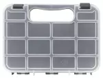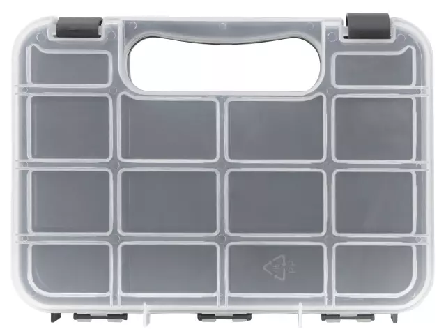 Durable injection molded plastic construction. Full height internal dividers to keep parts separated. Store flat or upright with built in feet.